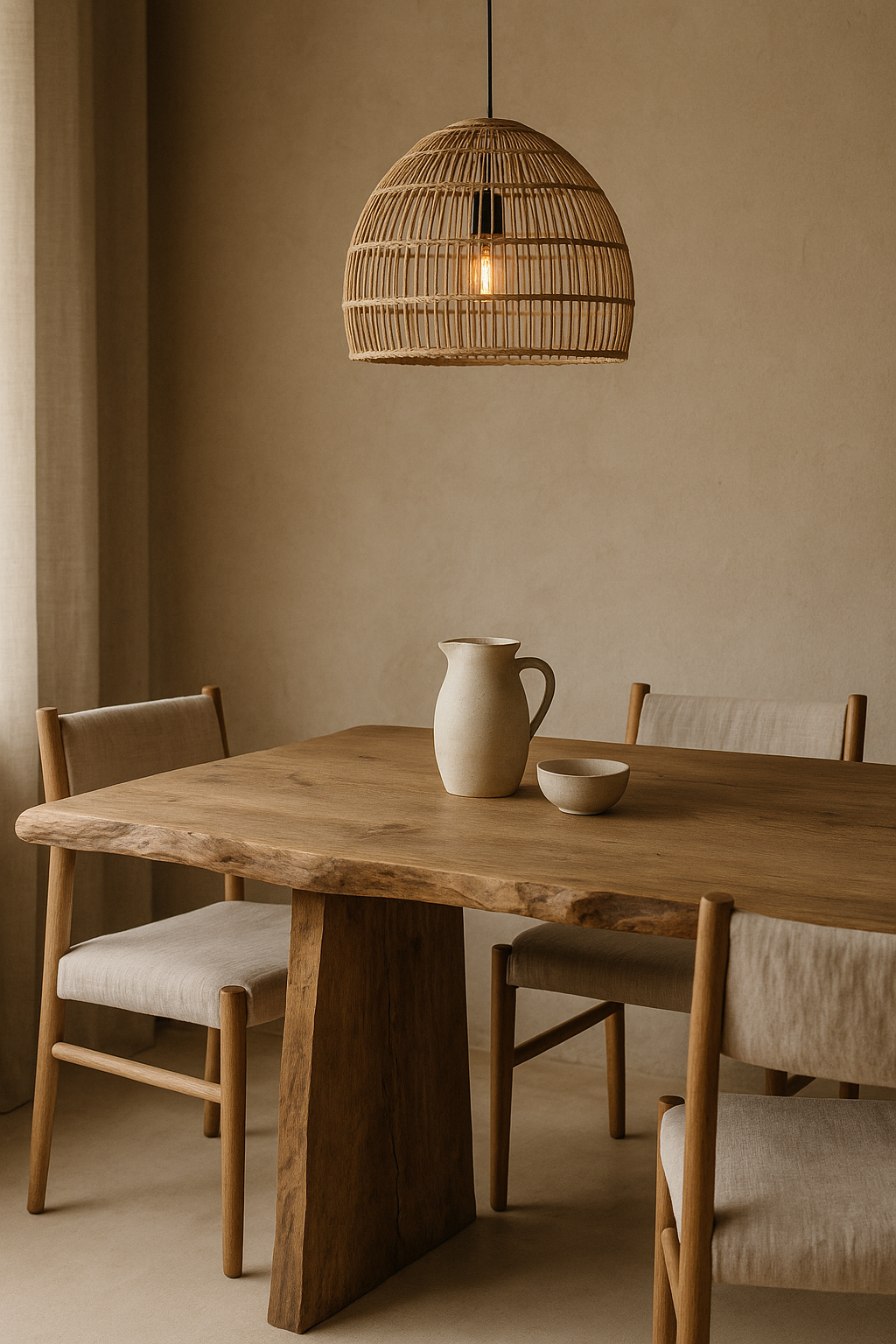 Luminaires en rotin, chaises et fauteuils aux lignes épurées, façonnés avec soin dans des matériaux nobles.