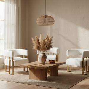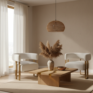 Sa structure métallique dorée apporte stabilité et élégance, tandis que sa forme semi-circulaire et ses finitions douces s’inspirent du wabi-sabi japonais — une beauté simple, intemporelle et apaisée.